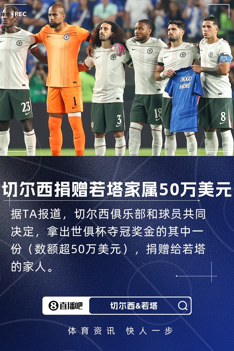 08月14日讯 据TA报道,切尔西俱乐部和球员共同决定,将部分世俱杯奖金捐给若塔及其弟弟安德烈的家人,数额超50万美元。