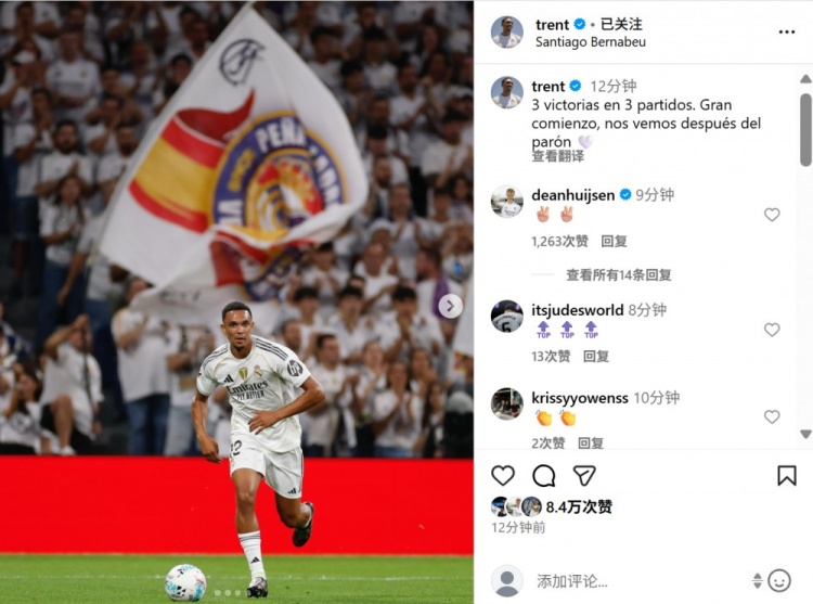 皇马新援阿诺德也在社媒晒出本场照片,配文写道:“3场比赛3场胜利,这是好的开始,让我们在国际比赛日之后再见!”